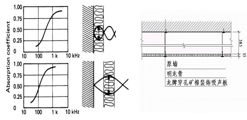 当多孔吸声材料背后有空腔时,中低频吸声性能比材料实贴在硬底面上会有较大提高。